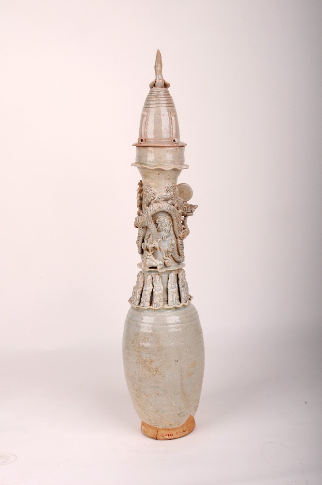 清灰釉青花(huā)龍鳳牡丹紋雙獅耳瓶
