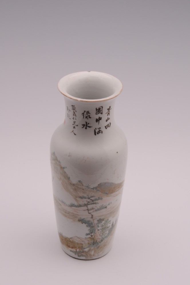 民(mín)國(guó)子(zǐ)常淺绛彩山(shān)水(shuǐ)草(c<$ǎo)廬紋敞口瓶
