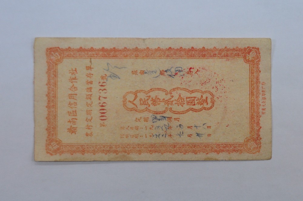 1958年(nián)贛南(nán)區(qū)信 'δ$用(yòng)合作(zuò)社農(nóng)村(cūn)定額有(yǒu)獎儲蓄貳圓存單★'&