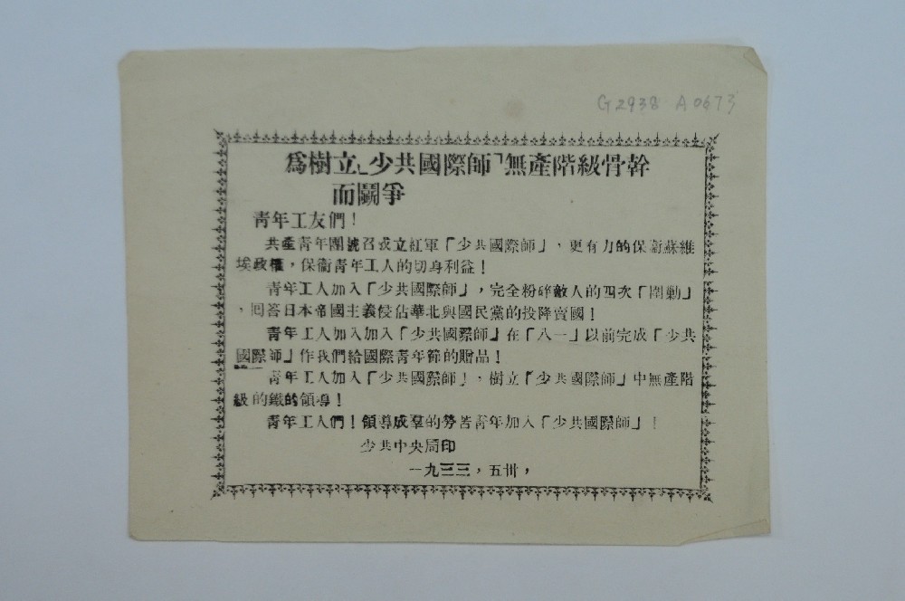 1933年(nián)6月(yuè)30日(rì)少(shε×ǎo)共中央省委翻印的(de)《為(wèi)樹(shù)立“少(shǎo)共國(guó)際師(→✔∏shī)”無産階級骨幹師(shī)鬥争》傳單