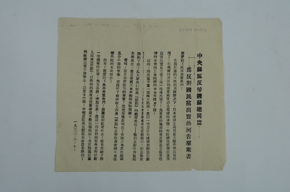 1932年(nián)中央蘇區(qū)反帝擁蘇總同盟印制(zhì)的(de)《ε'₹≈為(wèi)反對(duì)國(guó)民(mín)黨出賣熱(rè)♥λ河(hé)告群衆書(shū)》