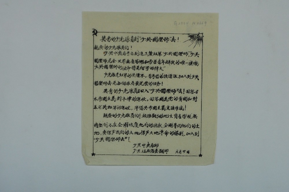 1933年(nián)少(shǎo)共中央省委翻印的(de)《英勇的(de)少(s☆¶§σhǎo)先隊員(yuán)到(dào)“少(shǎo)共國(guó)際師 ♣ (shī)”去(qù)》傳單
